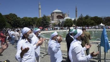 Αμέσως μετά τις κραυγές του Αλαχού Ακμπάρ, που υψώθηκαν στην πλημμυρισμένη από κόσμο πλατεία Σουλταναχμέτ, ο Ρετζέπ Ταγίπ Ερντογάν, φορώντας στο κεφάλι το λευκό τακέ, έψαλε καθισμένος οκλαδόν στην Αγία Σοφία, μπροστά από τους παρατεταγμένους ιμάμηδες, μόνος, την πρώτη σούρα του Κορανίου. Λίγα λεπτά μετά άρχισε το πρώτο Ναμάς, η πρώτη προσευχή στο «Τζαμί Αγία Σοφία» πλέον, 24 Ιουλίου, στοχευμένα την ίδια ημέρα που το 1923 υπογράφηκε η συνθήκη της Λωζάνης (!), χοροστατούντος του επικεφαλής της Ανώτατης Θρησκευτικής Αρχής Αλή Ερμπά, ο οποίος στο τέλος της «παράστασης» κράδαινε ένα ξίφος στον αέρα, ουρλιάζοντας: «Οποιος τολμήσει να αγγίξει αυτό το κτίριο, θα καεί»!