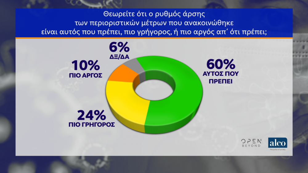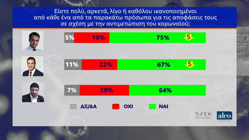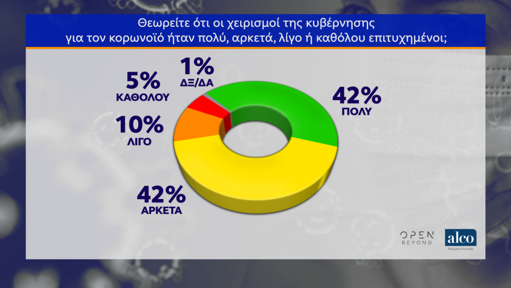 Nέα μεγάλη δημοσκόπηση για λογαριασμό του Open ΤV πραγματοποίησε η ALCO με ενδιαφέροντα ευρήματα αναφορικά με τον κορονοϊό, αλλά και τις πολιτικές προεκτάσεις. Ο θετικός αντίκτυπος από τη διαχείριση της πανδημίας του κορονοϊού από την κυβέρνηση πιστώνεται αριθμητικά στον δείκτη εμπιστοσύνης, αφού ελάχιστοι εκτιμούν ότι θα γίνουν εκλογές.