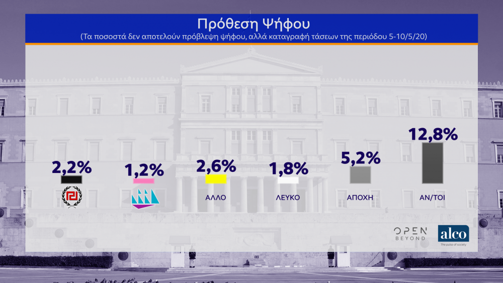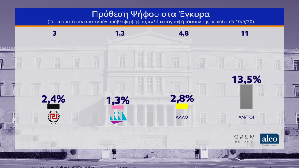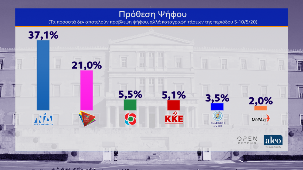 Στην πρόθεση ψήφου επί των έγκυρων, η ΝΔ συγκεντρώνει 40%, έναντι 22,6% του ΣΥΡΙΖΑ, δηλαδή 17,4 ποσοστιαίες μονάδες. Στο 5,9% το ΚΙΝΑΛ, στο 5,1% το ΚΚΕ, στο 3,8% η Ελληνική Λύση, στο 2,2% το ΜέΡΑ25. Η συντριπτική πλειοψηφία των ερωτηθέντων δηλώνουν ικανοποιημένοι από τους χειρισμούς του Κυριάκου Μητσοτάκη, του Βασίλη Κικίλια και του Νίκου Χαρδαλιά, ενώ χαρακτηριστικό είναι το γεγονός ότι 6 στους 10 ψηφοφόρους του ΣΥΡΙΖΑ συμφωνούν με τη στάση του Αλέξη Τσίπρα στην αντιμετώπιση της κρίσης του κορονοϊού.