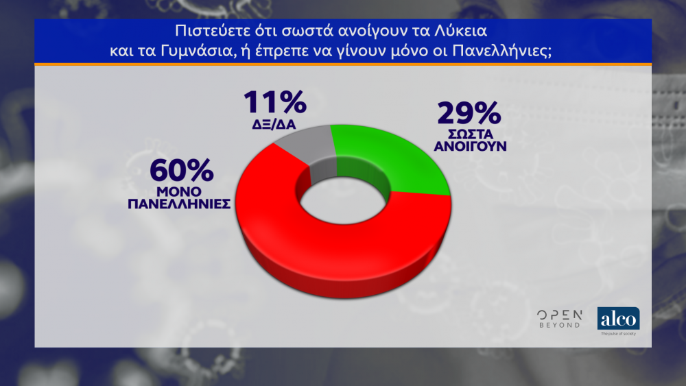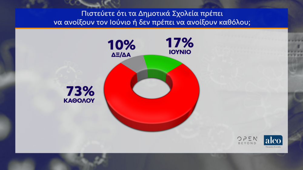 Όσον αφορά στο άνοιγμα των σχολείων, οι περισσότεροι συμμετέχοντες στη δημοσκόπηση πιστεύουν ότι τα σχολεία έπρεπε να ανοίξουν μόνο για τις Πανελλήνιες, ενώ ειδικά για τα Δημοτικά σχολεία θεωρούν ότι δεν θα έπρεπε να ανοίξουν καθόλου. Ειδικότερα, για το αν ανοίγουν σωστά τα Λύκεια και τα Γυμνάσια ή θα έπρεπε να διεξαχθούν μόνο οι Πανελλήνιες, το 60% θεωρεί ότι έπρεπε να διεξαχθούν μόνο οι Πανελλαδικές οι εξετάσεις, με το 29% να θεωρεί σωστή την απόφαση. Για τα Δημοτικά σχολεία το 73% θεωρεί ότι δεν πρέπει να ανοίξουν, ενώ το 17% πιστεύει ότι πρέπει να ανοίξουν τον Ιούνιο.