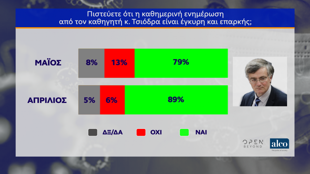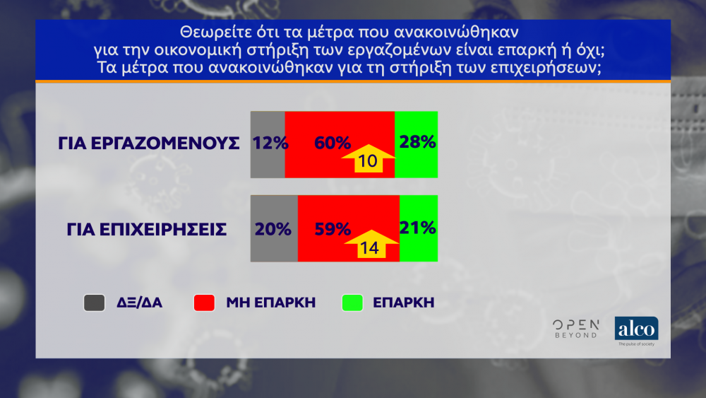 Στο θέμα των εργασιακών και της στήριξης των επιχειρήσεων σχεδόν 6 στους 10 κρίνουν τα μέτρα που έχουν ληφθεί ως μη επαρκή, τόσο για τους εργαζομένους όσο και για τις επιχειρήσεις. Οι ερωτηθέντες θεωρούν ότι τα οικονομικά μέτρα για τους εργαζόμενους είναι μη επαρκή με ποσοστό 60% και 28% επαρκή. Αντίστοιχα είναι και τα ποσοστά για τις επιχειρήσεις με 59% μη επαρκή και 21% επαρκή. Τέλος, η ενημέρωση για την εξέλιξη της πανδημίας από τον καθηγητή Σωτήρη Τσιόδρα εκτιμάται ως έγκυρη και επαρκής από το εντυπωσιακό 79% των ερωτηθέντων. Να σημειωθεί πως το αντίστοιχο ποσοστό για τον Σωτήρη Τσιόδρα τον μήνα Απρίλιο έφτανε στο 89%!