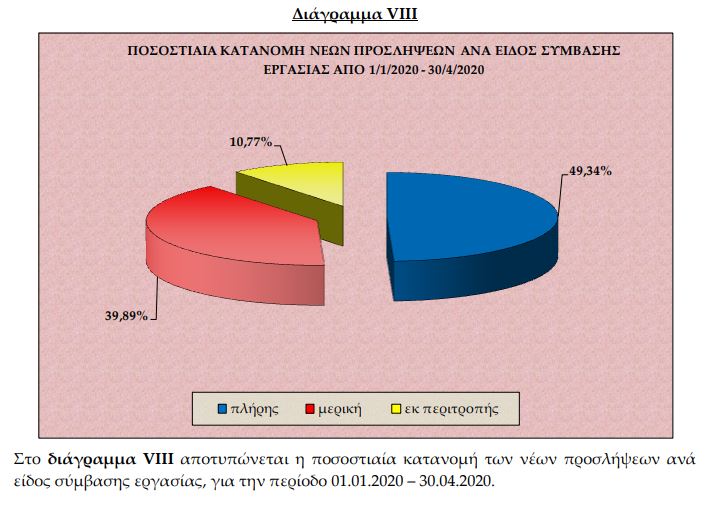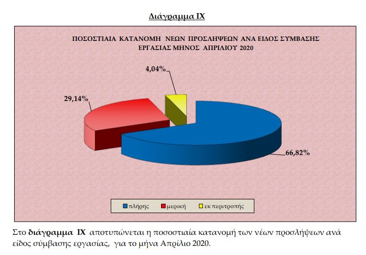 Είναι μάλλον εμφανές πως ενώ απουσιάζουν σχεδόν σε ολοκληρωτικό βαθμό από το μείγμα οι εποχικές προσλήψεις στον τουρισμό και τον επισιτισμό, οι οποίες έχουν παραδοσιακά μεγάλους βαθμούς ευελιξίας, η κατανομή των νέων προσλήψεων – όσων έγιναν – τον μήνα Απρίλιο έγειρε προς την πλήρη απασχόληση.