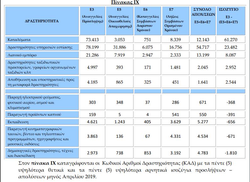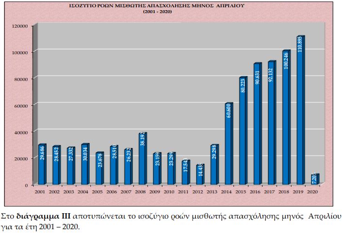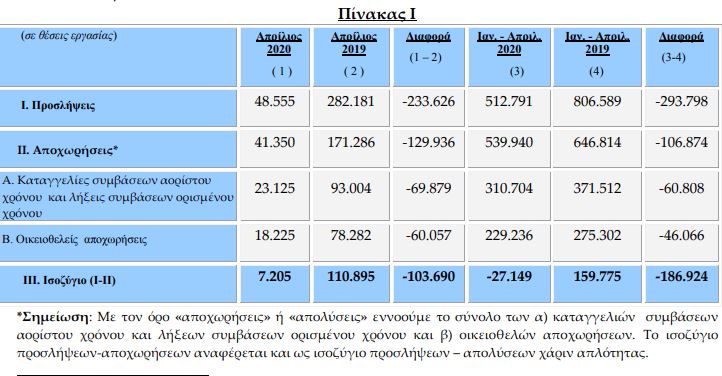 Πέρυσι τον Απρίλιο είχαν καταγραφεί 110.895 νέες θέσεις εργασίας. Συνεπώς η σύγκριση των στοιχείων των δύο μηνών, Απρίλιος 2020 και Απρίλιος 2019 οδηγεί στο συμπέρασμα – όπως καταγράφεται στην έκθεση – πως προκύπτει αρνητική επίδοση κατά 103.690 λιγότερες θέσεις εργασίας για τον Απρίλιο 2020 έναντι του Απριλίου του 2019.
