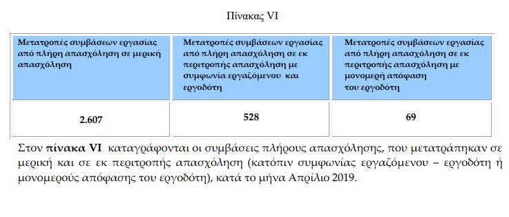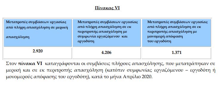 Αντίθετα, οι μετατροπές από πλήρη σε μερική απασχόληση δεν έχουν τόσο κατακόρυφα αυξηθεί. Τον περασμένο Απρίλιο καταγράφηκαν 2.920 μετατροπές (απαιτείται η συμφωνία του εργαζόμενου) έναντι 2.607 τον Απρίλιο του 2019. Αντίστοιχα τον Μάρτιο του 2020 μετρήθηκαν 3.449 μετατροπές από πλήρη σε μερική έναντι 2.516 τον Μάρτιο του 2019.