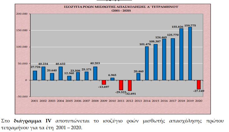 Η πρωτόγνωρη κατάρρευση των εποχικών προσλήψεων οδηγεί το ισοζύγιο του πρώτου 4μηνου σε αρνητικό πρόσημο για πρώτη φορά μετά την μεγάλη κρίση του 2012. Το πρώτο 4μηνο φέτος χάθηκαν 27.149 θέσεις εργασίας. Η αμέσως προηγούμενη χρονιά με αρνητικό πρόσημο στα ισοζύγια απασχόλησης (προσλήψεις μείον απολύσεις – λήξεις συμβάσεων) ήταν το 2012, όταν το πρώτο 4μηνο είχαν χαθεί 32.691 θέσεις εργασίας. Πριν το 2012 αρνητικό πρόσημο στα ισοζύγια απασχόλησης είχε καταγραφεί μόνο το 2011 – το πρώτο 4μηνο είχαν χαθεί 29.523 θέσεις εργασίας – και το 2009 όταν χάθηκαν 13.697 θέσεις εργασίας. Σε όλες τις υπόλοιπες χρονιές από το 2001 μέχρι σήμερα το πρόσημο είναι θετικό, ενώ τα τελευταία χρόνια από το 2014 και μετά αυξανόταν προοδευτικά ανά έτος.