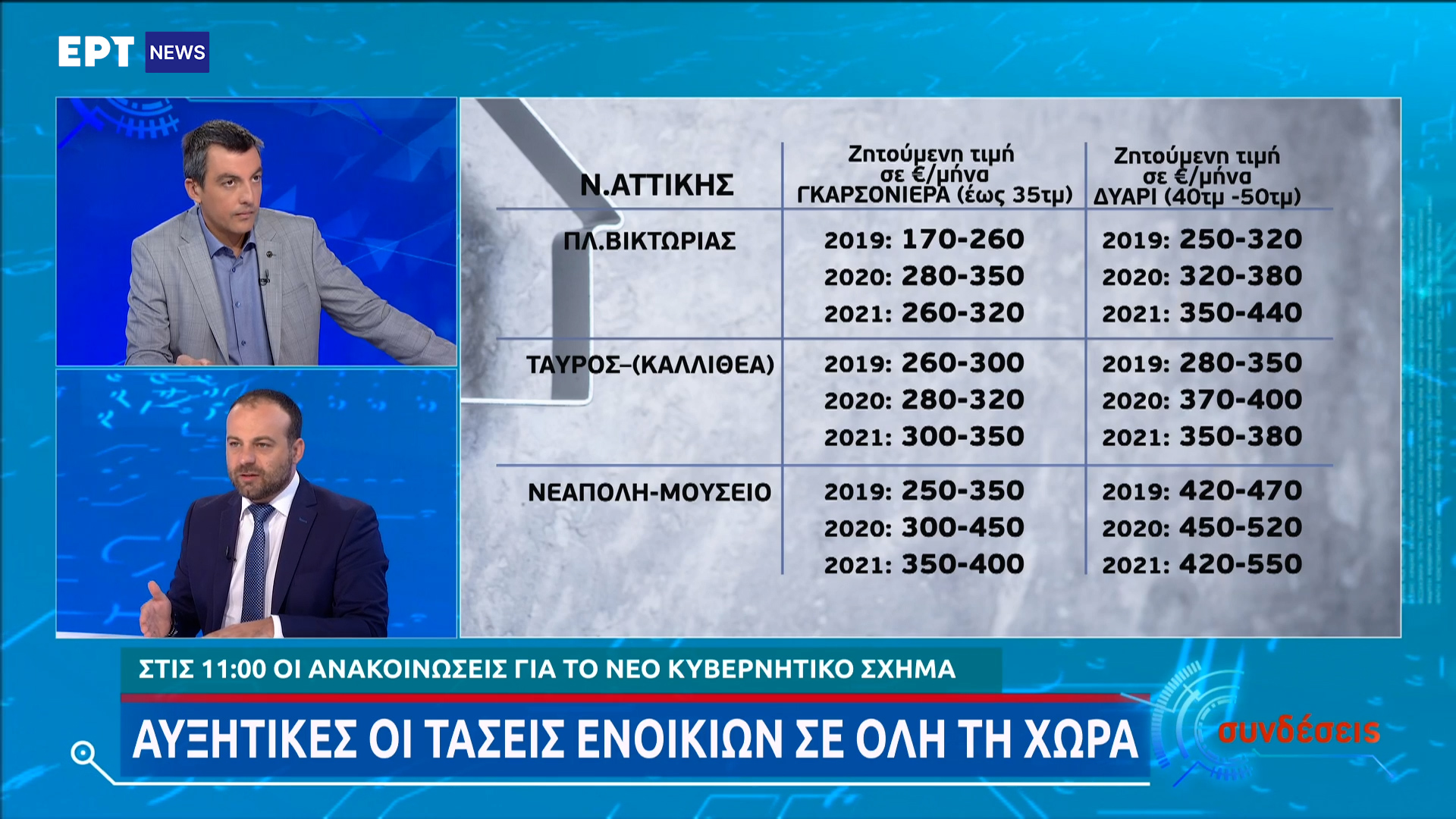 Μιλώντας στην ΕΡΤ ο πρόεδρος Πανελλαδικού Δικτύου Ε-Real Estates είπε ότι για γκαρσονιέρες στην Αττική η τιμή ξεκινά από 260 € και μπορεί να φτάσει και τα 400 €.