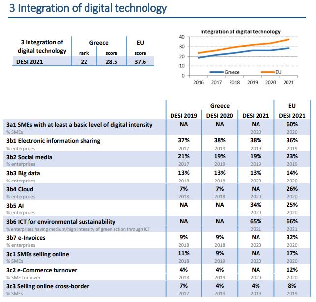 Αναφορικά με την ενσωμάτωση της ψηφιακής τεχνολογίας στις επιχειρηματικές δραστηριότητες, η Ελλάδα κατατάσσεται στην 22η θέση στην ΕΕ. Οι ψηφιακές τεχνολογίες υιοθετούνται αργά από τις ελληνικές επιχειρήσεις, καθώς μόνο το 19% χρησιμοποιεί τα μέσα κοινωνικής δικτύωσης σε σύγκριση με τον μέσο όρο του 23% στην ΕΕ. Το 38% των επιχειρήσεων χρησιμοποιεί ηλεκτρονική ανταλλαγή πληροφοριών (άνω του μέσου όρου του 36% στην ΕΕ).