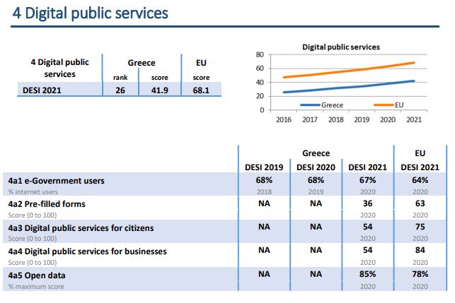 Η Ελλάδα βρίσκεται στην 26η θέση στην ΕΕ ως προς τις ψηφιακές δημόσιες υπηρεσίες. Σύμφωνα με τον δείκτη ωριμότητας των ανοικτών δεδομένων, η Ελλάδα, με 85% το 2020, παρουσιάζει καλές επιδόσεις, ξεπερνώντας αρκετά τον μέσο όρο του 78% στην ΕΕ. Η χώρα μας με ποσοστό 67% είναι επίσης πάνω από τον ευρωπαϊκό μέσο όρο του 64% σε ό,τι αφορά τους ενεργούς χρήστες υπηρεσιών ηλεκτρονικής διακυβέρνησης.