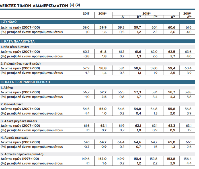 Σύµφωνα µε τους αναλυτές, η ελληνική αγορά ακινήτων έχει εισέλθει σε τροχιά ανάκαµψης, κάτι ήταν αναµενόµενο µετά την πορεία σταθεροποίησης που εµφάνισε τα τελευταία χρόνια. Ενδεικτικά, το πρώτο τρίµηνο του 2018 οι τιµές διαµερισµάτων είχαν µειωθεί κατά 0,2%, σε σύγκριση µε το αντίστοιχο διάστηµα του 2017, ενώ είχαν υποχωρήσει 1% και 2,4% τα έτη 2017 και 2018, αντίστοιχα. Αξίζει να σηµειωθεί ότι η διαφορά ως προς την αύξηση των τιµών µεταξύ νέων και παλαιών, δηλαδή ηλικίας άνω των 5 ετών, διαµερισµάτων είναι πενιχρή.