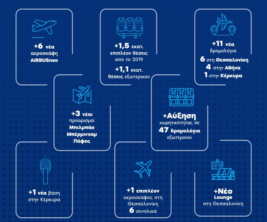 Το συνολικό πρόγραμμα εμπλουτίζεται με 11 νέα δρομολόγια σε διεθνείς προορισμούς από τις βάσεις της Αθήνας και της Θεσσαλονίκης και τη νέα βάση της Κέρκυρας, καθώς και με 3 νέους προορισμούς από Αθήνα για Μπέρμινχαμ, Πάφο και Μπιλμπάο. Παράλληλα, αυξάνει την χωρητικότητά της σε επιπλέον 47 δρομολόγια εξωτερικού. Από το σύνολο του 1,5 εκατομμυρίου επιπλέον θέσεων σε σύγκριση με το 2019, οι 1,1 είναι θέσεις εξωτερικού, ενώ σε διεθνείς προορισμούς αντιστοιχούν οι 11,4 εκατομμύρια από τις 19,2 εκατομμύρια διαθέσιμες θέσεις συνολικά. Είναι χαρακτηριστικό ότι το 80% του κύκλου εργασιών της εταιρίας αφορά το εξωτερικό.