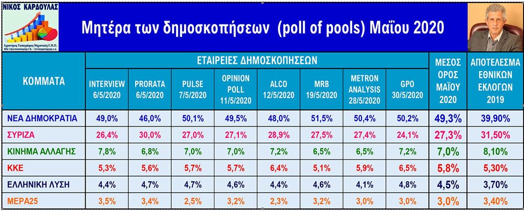 Χαρακτηρίζεται η «μητέρα των δημοσκοπήσεων» καθώς αποτελεί το απόσταγμα οκτώ δημοσκοπήσεων που έγιναν εντός του Μαΐου 2020 από ισάριθμες δημοσκοπικές εταιρείες. H παρούσα ανάλυση έγινε από τον Νίκο Καρδούλα (Αγρονόμο Τοπογράφο Μηχανικός Ε.Μ.Π., MSc_UK, Συνταγματάρχης ε.α.) εφαρμόζοντας τη μέθοδο υπολογισμού του μέσου όρου των προβλέψεων όλων των πολιτικών ερευνών, που δημοσιεύθηκαν τις τελευταίες τέσσερις εβδομάδες.