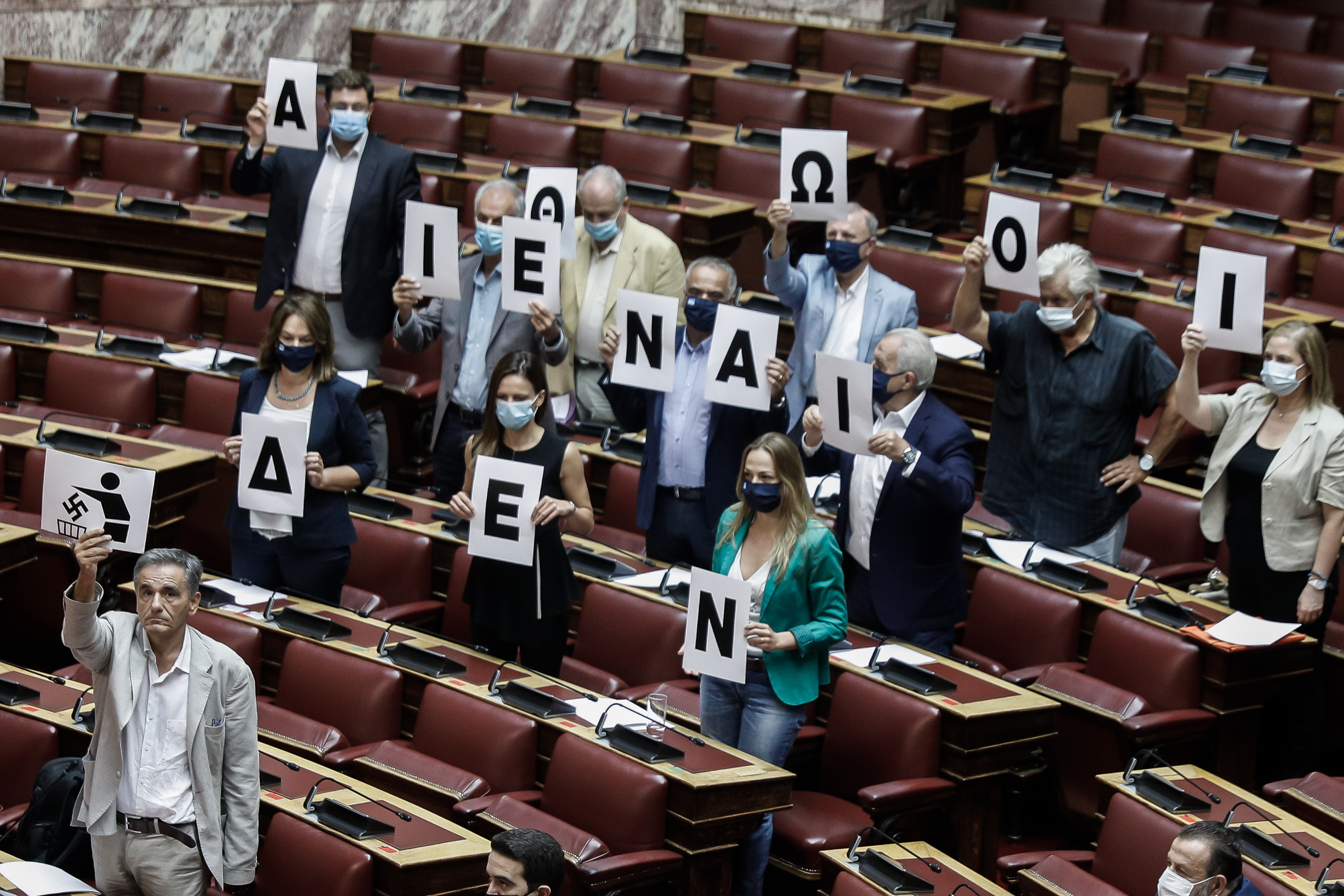 Λίγες ώρες πριν από την ανακοίνωση της ετυμηγορίας της πολυετούς δίκης της Χρυσής Αυγής, η οποία θα κρίνει και με τη «βούλα» εάν το μόρφωμα δρούσε ως εγκληματική οργάνωση, βουλευτές του ΣΥΡΙΖΑ - Προοδευτική Συμμαχία προχώρησαν σε μια συμβολική παρέμβαση στην Ολομέλεια της Βουλής.