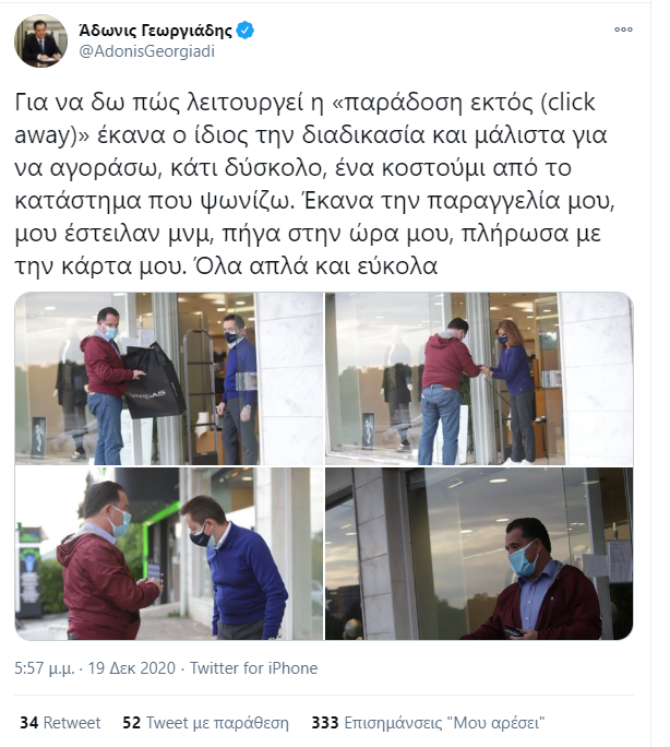 Μάλιστα την Παρασκευή 18 Δεκεμβρίου, ο Άδωνις Γεωργιάδης εξέφρασε την πεποίθησή του ότι το μέτρο της «παραδόσεως εκτός», αλλιώς click away στο λιανεμπόριο, θα αποδειχθεί λειτουργικό για την αγορά.