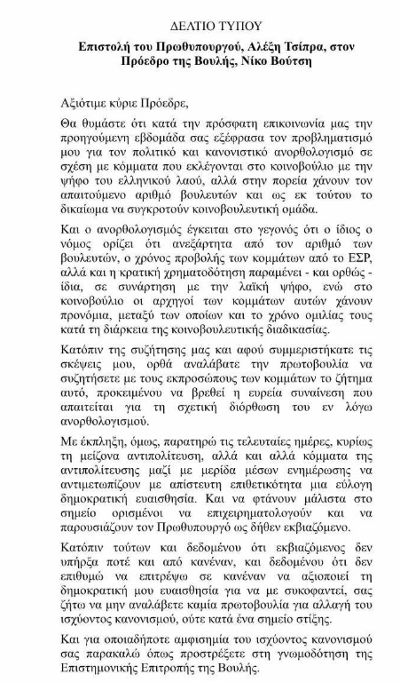 Θα θυμάστε ότι κατά την πρόσφατη επικοινωνία μας την προηγούμενη εβδομάδα σας εξέφρασα τον προβληματισμό μου για τον πολιτικό και κανονιστικό ανορθολογισμό σε σχέση με κόμματα που εκλέγονται στο κοινοβούλιο με την ψήφο του ελληνικού λαού, αλλά στην πορεία χάνουν τον απαιτούμενο αριθμό βουλευτών και ως εκ τούτου το δικαίωμα να συγκροτούν κοινοβουλευτική ομάδα.