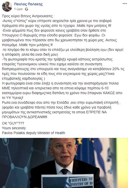 Η απάντηση του υφυπουργού Υγείας μέσω Facebook στα όσα είπε γι' αυτόν και το... τσιγάρο του ο Ευρωπαίος Επίτροπος Υγείας, δεν άργησε να έρθει.