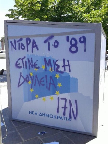 «Ντόρα το '89 έγινε μισή δουλειά. 17Ν», έγραψαν άγνωστοι σε προεκλογικό περίπτερο της Νέας Δημοκρατίας στα Γιάννενα. Σε άλλη μεριά του περιπτέρου γράφει «Κούλη σε τσούζει του Ξηρού το ούζι».