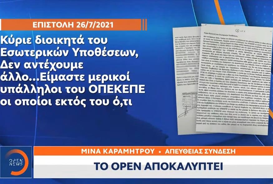 Μια ανώνυμη επιστολή φαίνεται πως ήταν η άκρη του νήματος που οδήγησε να ξετυλιχθεί το κουβάρι του σκανδάλου του ΟΠΕΚΕΠΕ, όπως αποκάλυψε η Μίνα Καραμήτρου στο Κεντρικό Δελτίο Ειδήσεων του OPEN.