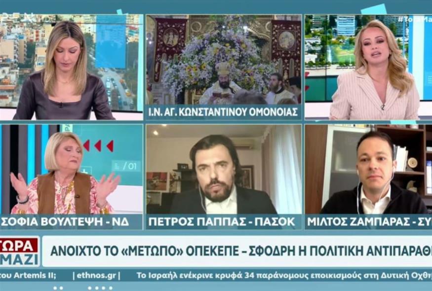 Μια εκρηκτική τηλεοπτική αναμέτρηση εκτυλίχθηκε στην εκπομπή «Τώρα Μαζί» του OPEN, με τη Σοφία Βούλτεψη, τον Πέτρο Παππά και τον Μίλτο Ζαμπάρα να «διασταυρώνουν τα ξίφη τους» για τον ΟΠΕΚΕΠΕ, την Ευρωπαϊκή Εισαγγελία, αλλά και το πτυχίο του Μακάριου Λαζαρίδη.