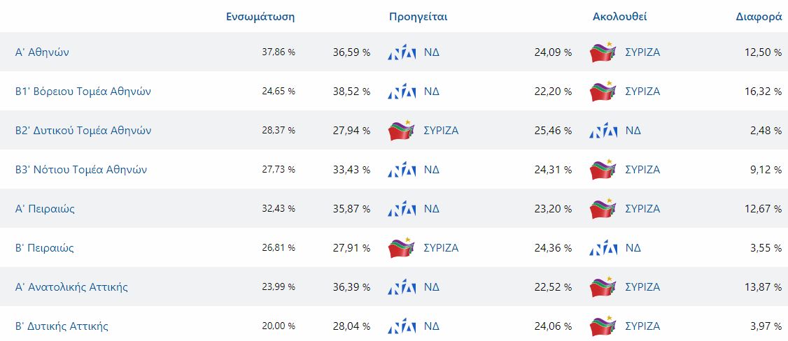 Στην Α' εκλογική περιφέρειας της Ανατολικής Αττικής η Νέα Δημοκρατία βρίσκεται στο +13,71 από τον ΣΥΡΙΖΑ και στην Β' εκλογική περιφέρεια Δυτικής Αττικής στο +2,90%.