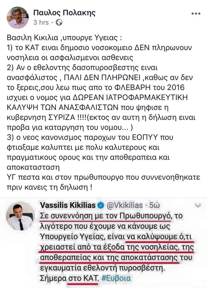 «Κύριε Πολάκη, γνωρίζω ακριβώς την κατάσταση της υγείας του εθελοντή δασοπυροσβέστη. Η πλήρης αποκατάσταση και αποθεραπεία του, απαιτούν δαπάνες που δεν καλύπτει το ΕΣΥ και ο ΕΟΠΥΥ. Θα καλύψουμε Ο,ΤΙ ΧΡΕΙΑΣΤΕΙ... όπως καλύψαμε πλήρως και τους εγκαυματίες από την τραγική φωτιά στο Μάτι, που ΑΦΗΣΕΣ ΑΚΑΛΥΠΤΟΥΣ 1 χρόνο τώρα. Τέλος με τα ψέματά σας και τη μικροπολιτική».