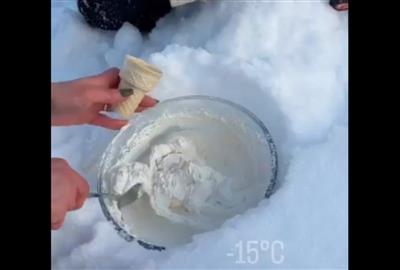 Με μόλις τρία υλικά - κρέμα, ζάχαρη και βανίλια - τοποθετεί το μείγμα σε ένα μπολ έξω στην αυλή, αφήνοντας το τσουχτερό κρύο να κάνει όλη τη δουλειά