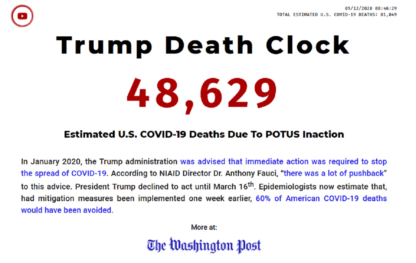 «Το ρολόι των θανάτων εξαιτίας του Τραμπ»: έτσι βάφτισε ο σκηνοθέτης Γιουτζίν Τζαρέκι τον φωτεινό πίνακα που εγκαταστάθηκε πρόσφατα στην πιο πολυσύχναστη πλατεία της Νέας Υόρκης και αναγράφει τον αριθμό των θυμάτων εξαιτίας της πανδημίας του κορονοϊού στις ΗΠΑ που θα μπορούσαν να είχαν σωθεί, κατ’ αυτόν, αν ο ένοικος του Λευκού Οίκου είχε αναλάβει δράση πιο γρήγορα.