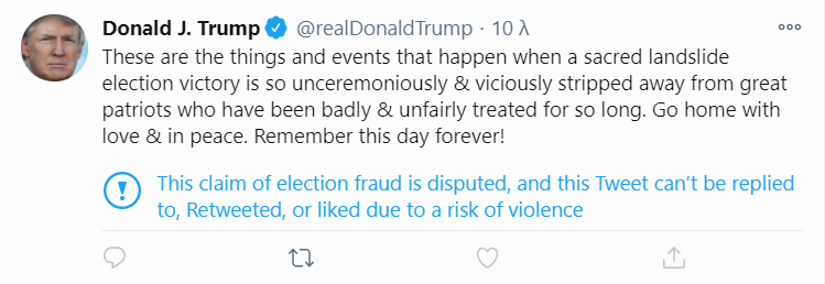 Ο Ντόναλντ Τραμπ όμως επανήλθε, γράφοντας: «Αυτά συμβαίνουν όταν μια ιερή εκλογική νίκη αποσπάται τόσο ανεπιθύμητα και άγρια από μεγάλους πατριώτες που τους έχουν φερθεί άσχημα και άδικα για τόσο καιρό. Πηγαίνετε σπίτι με αγάπη και ειρήνη. Να θυμάστε αυτή την ημέρα για πάντα».