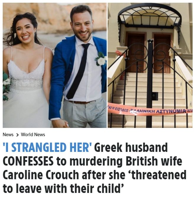 Η ομολογία δολοφονίας από τον 33χρονο βρίσκεται σε εκτενές άρθρο της Sun με τον ανατριχιαστικό τίτλο «Τη στραγγάλισα»: «Ο Έλληνας σύζυγος ομολόγησε ότι δολοφόνησε τη Βρετανίδα γυναίκα του αφότου εκείνη τον απείλησε πως θα έφευγε με το παιδί τους» γράφει η βρετανική εφημερίδα.