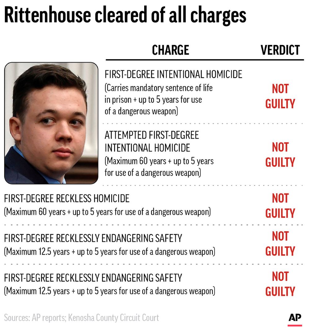Ο 18χρονος, ο οποίος κινδύνευε να καταδικαστεί σε ισόβια κάθειρξη, δήλωνε ότι ενήργησε εβρισκόμενος σε νόμιμη άμυνα όταν πυροβόλησε με ένα ημιαυτόματο τουφέκι κατά τη διάρκεια των χαοτικών αντιρατσιστικών διαδηλώσεων στο Γουισκόνσιν, στις 25 Αυγούστου 2020.