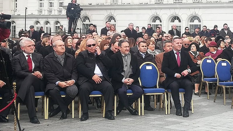 Στην σημερινή τελετή στην πρώτη σειρά κάθονταν τρεις πρώην πρωθυπουργοί της γειτονικής χώρας, ο Λούπτσο Γκεοργκέφσκι, ο Χάρι Κοστόφ και ο Βλάντο Μπουκόφσκι ενώ το παρών έδωσαν υπουργοί της κυβέρνησης Ζάεφ, στελέχη του επιτελείου του ΝΑΤΟ στη χώρα, καθώς και πρέσβεις των κρατών-μελών του ΝΑΤΟ στα Σκόπια.