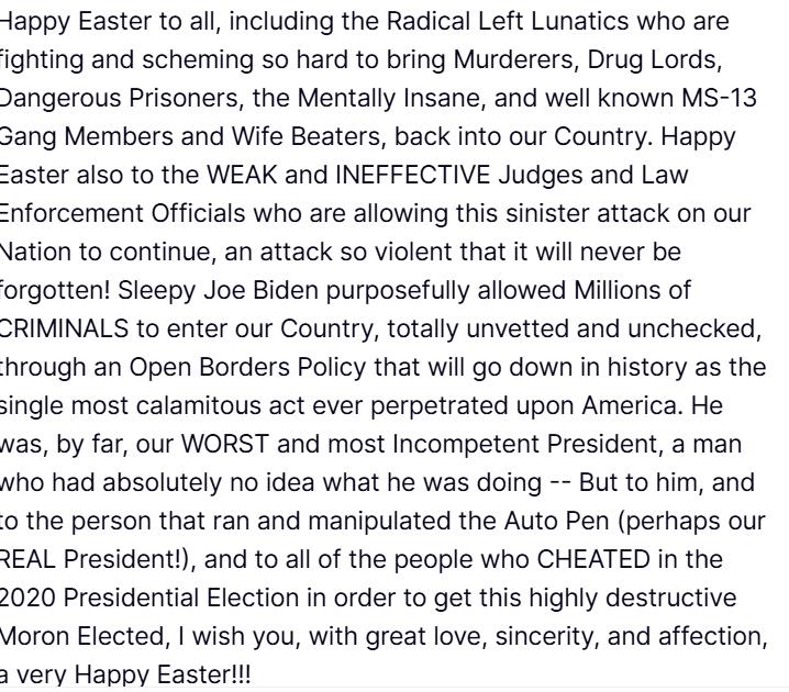 «Καλό Πάσχα σε όλους, συμπεριλαμβανομένων των Ριζοσπαστικών Αριστερών Παλαβών που παλεύουν και στέκονται σθεναρά εμπόδιο για να φέρουν Δολοφόνους, Βαρόνους Ναρκωτικών, Επικίνδυνους Φυλακισμένους, Ψυχικά Παράφρονες και γνωστά μέλη της συμμορίας MS-13 και ανθρώπους που κακοποιούν τις συζύγους τους, πίσω στη χώρα μας.