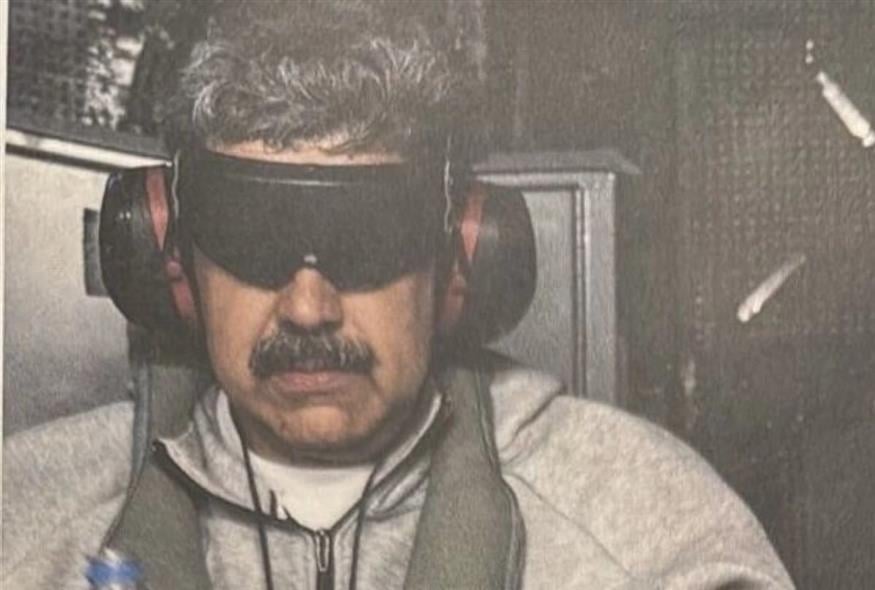 Στη φωτογραφία, ο Μαδούρο φορά χειροπέδες και γυαλιά-μάσκες «ώστε να μη βλέπει πού βρίσκεται και πού κινείται από το Σημείο Α στο Σημείο Β», είπε ο Μίλερ στην Έριν Μπερνέτ της CNN.