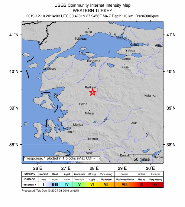 Ισχυρός σεισμός σημειώθηκε το βράδυ της Τρίτης, στις 22:14 στην Τουρκία. H πρώτη εκτίμηση για το μέγεθος του σεισμού από την Υπηρεσία Γεωλογικής Έρευνας των ΗΠΑ είναι στα 4,7 Ρίχτερ.