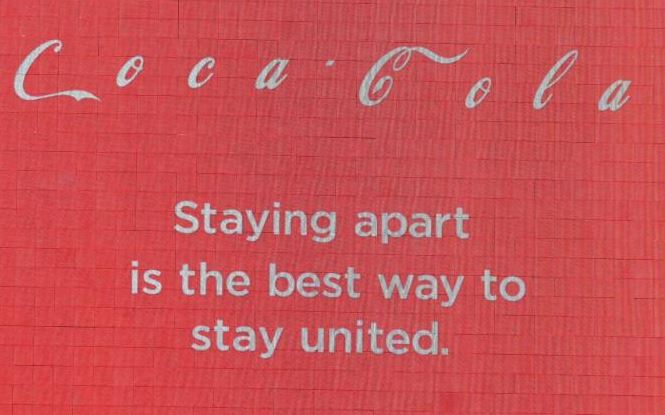 O κολοσσός της Coca-Cola σε μια από τις φωτεινές επιγραφές που διατηρεί στην περίφημη Times Square της Νέας Υόρκης, άλλαξε logo και διατήρησε τις αποστάσεις στα γράμματα ενός εκ των πιο γνωστών trademarks στον πλανήτη. «Μένοντας χωριστά είναι ο καλύτερος τρόπος για να μείνουμε συνδεδεμένοι» ήταν το μήνυμα της εταιρείας σε μια πλατεία που μέχρι πρότινος έσφυζε από ζωή αλλά πλέον έχει νεκρώσει λόγο του κορονοϊού που θερίζει και τις ΗΠΑ.