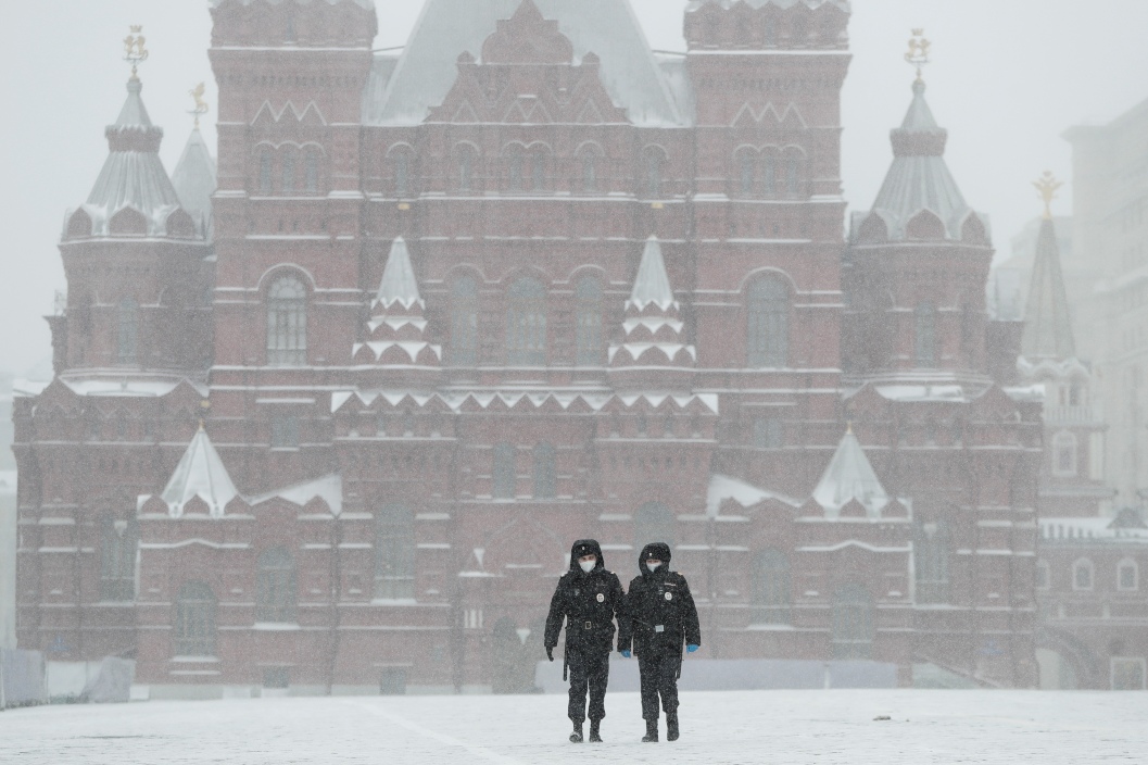 Η εμβληματική Κόκκινη Πλατεία στο κέντρο της Μόσχας ξημέρωσε στα... λευκά αλλά και ερημωμένη λόγω του κορονοϊού. Ο πρόεδρος Πούτιν έλαβε την απόφαση για lockdown προκειμένου να περιοριστεί η μετάδοση του ιού στη ρωσική πρωτεύουσα.