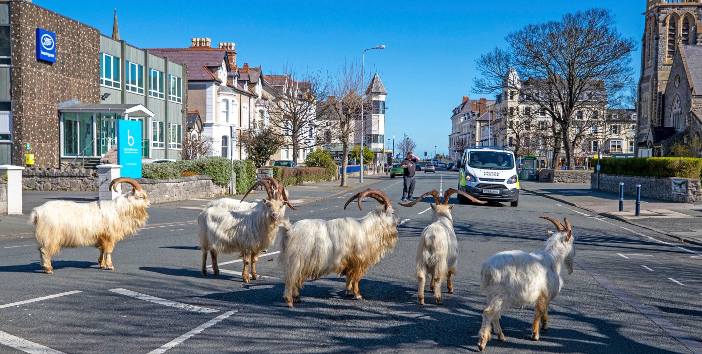 Ενα κοπάδι από κατσίκες, άφησε τα λιβάδια και τους αγρούς και περπατά στους άδειους και ήσυχους δρόμους στο Λάνταντνο της Ουαλίας, όπου έχει επιβληθεί lockdown, όπως και σε όλη τη Μεγάλη Βρετανία.