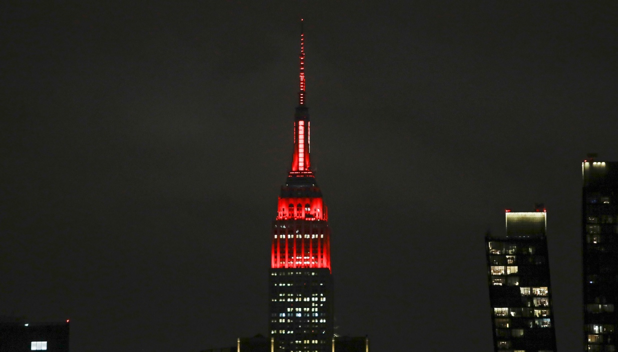 Η κορυφή του περίφημου Empire State Building αναβόσβηνε όλη τη νύχτα, σε κόκκινο και λευκό χρώμα, προκειμένου να τιμήσει τους εργαζόμενους στον τομέα της υγείας. Οι πολυσύχναστοι και θορυβώδεις δρόμοι της Νέας Υόρκης έχουν νεκρώσει καθώς «η πόλη που ποτέ δεν κοιμάται» πλήττεται σκληρά από τον κορονοϊό.