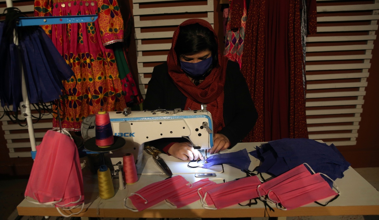 Μια γυναίκα στην Καμπούλ του Αφγανιστάν ράβει προστατευτικές μάσκες σε ένα εργοστάσιο που μέχρι πρότινος παρήγαγε είδη ρουχισμού. Οι τοπικές αρχές έχουν επιβάλλει lockdown τριών εβδομάδων στην πρωτεύουσα.