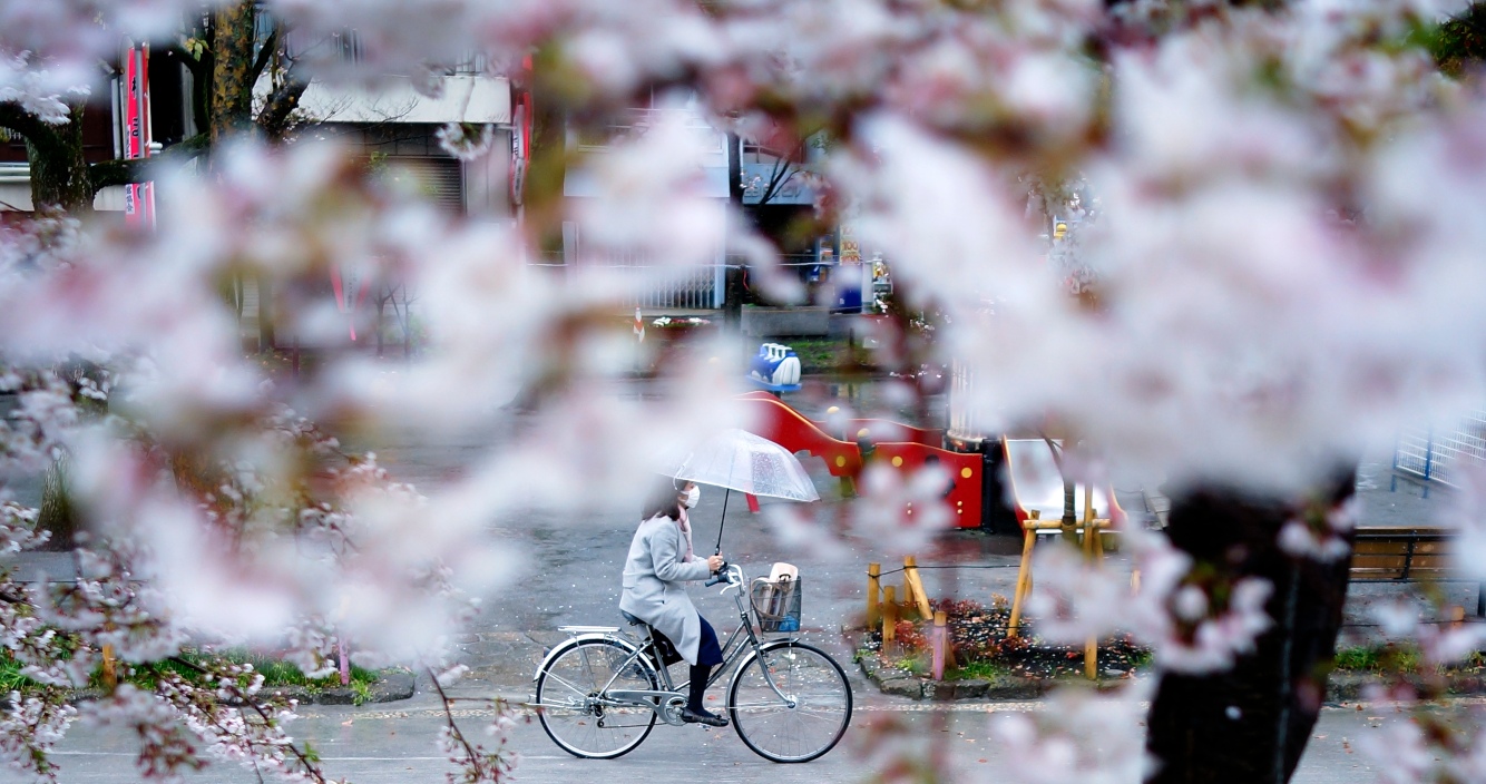 Μια Γιαπωνέζα φορώντας μάσκα κάνει ποδήλατο στο κέντρο του Τόκιο προσπερνώντας τις ανθισμένες κερασιές. Στο τέλος της ημέρας, η ζωή θα νικήσει...