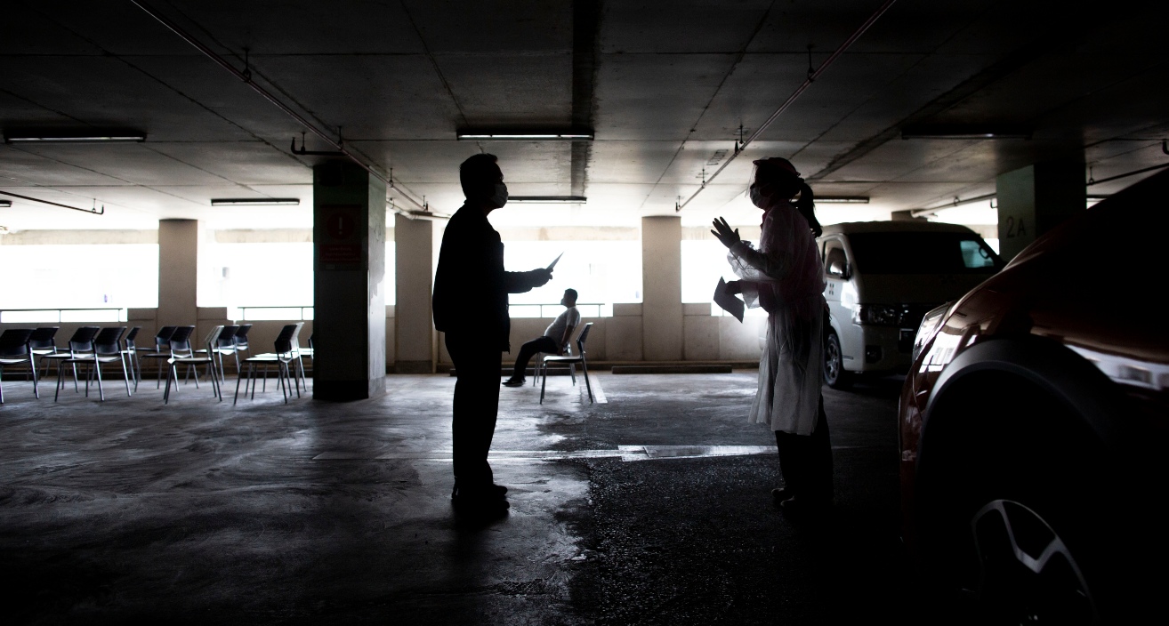Σε ένα σκοτεινό πάρκινγκ της Μπανγκόκ που έχει μετατραπεί σε εξεταστήριο για ασθενείς με συμπτώματα κορονοϊού, μια νοσοκόμα φορώντας στολή, γάντια και μάσκα συνομιλεί με έναν Ταϊλανδό, ενώ στο βάθος ένας συμπολίτης του περιμένει για να υποβληθεί στο τεστ.