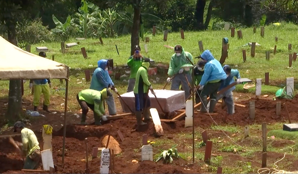 Οι συγγενείς σε μακρινή απόσταση, το φέρετρο σφραγισμένο και τυλιγμένο και οι εργάτες φορώντας γάντια και μάσκες. Αυτή είναι η ανατριχιαστική εικόνα από την κηδεία ενός θύματος του κορονοϊού στην Τζακάρτα...