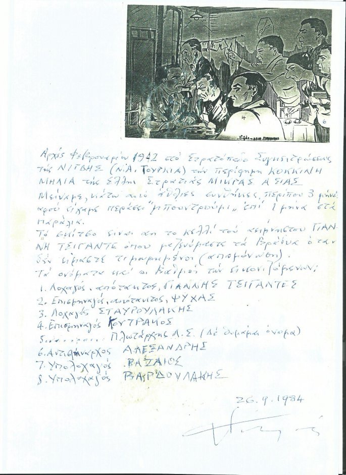 Ο Στρατηγός Ανδρέας Βαρδουλάκης είχε απαντήσει σε ανύποπτο χρόνο (με το κάτωθι σκίτσο). Το σκίτσο αυτό μου το έδωσε το 1984. (στην φυλακή της Νίγδης δεν υπήρχαν φωτογραφικές μηχανές!) Το μολύβι του Λοχαγού Σταυρουλακη, το 1942, απαθανάτησε την στιγμή! Είναι μοναδικό ενθύμιο και τεκμήριο της διαφυγής στην Μ.Ανατολή των Αξιωματικών που μετά από μύριες δυσκολίες και δοκιμασίες στο ταξείδι και στην χώρα του «επιτήδειου ουδέτερου» συνέχισαν τον πόλεμο.»