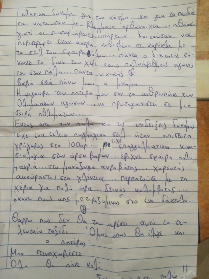 «Μην στεναχωριέστε όλα θα πάνε καλά. Αυτό μας έλεγε συνέχεια», είπε στο ethnos.gr ο υιος του Χρήστος. Λίγο πριν την εξόδιο ακολουθία έγραψε έναν σύντομο χαιρετισμό. Τι να πρωτοθυμηθεί, τι να πρωτογράψει, πως να τον χαρακτηρίσει, πως να τον περιγράψει;