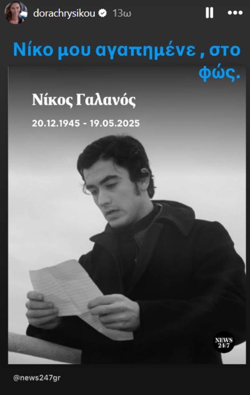 Όπως έγραψε η ηθοποιός στη λεζάντα της ανάρτησής της για τον θάνατο του Νίκου Γαλανού: «Αντίο Νικάκη μου. Πάλεψες λιονταρίσια με μεγάλη αξιοπρέπεια. Εγώ θα σε θυμάμαι έτσι όπως την τελευταία φορά καλέ μου. Στο φως εκεί να κουρνιάσεις».