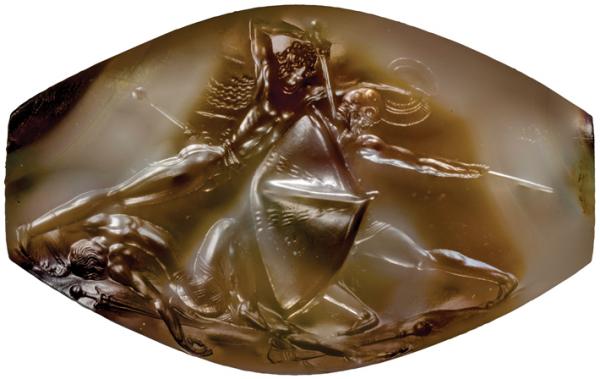 Η συντήρηση του ευρήματος έδειξε ότι ήταν ένας σφραγιδόλιθος, μία πέτρα με χάραγμα που σφράγιζε το κερί ή το μολύβι σαν «ταυτότητα» του κατόχου. Σιγά-σιγά, όσο αντιλαμβάνονταν ότι είχαν βρει ένα σπουδαίο εύρημα, ο ενθουσιασμός των αρχαιολόγων μεγάλωνε. Πάνω του υπήρχε μια εκπληκτικής ακρίβειας σκηνή μάχης, με λεπτομέρειες που μόλις είναι ορατές με γυμνό μάτι. Εικονίζει έναν πολεμιστή να σκοτώνει έναν αντίπαλο, ενώ ένας τρίτος πολεμιστής κείται νεκρός.