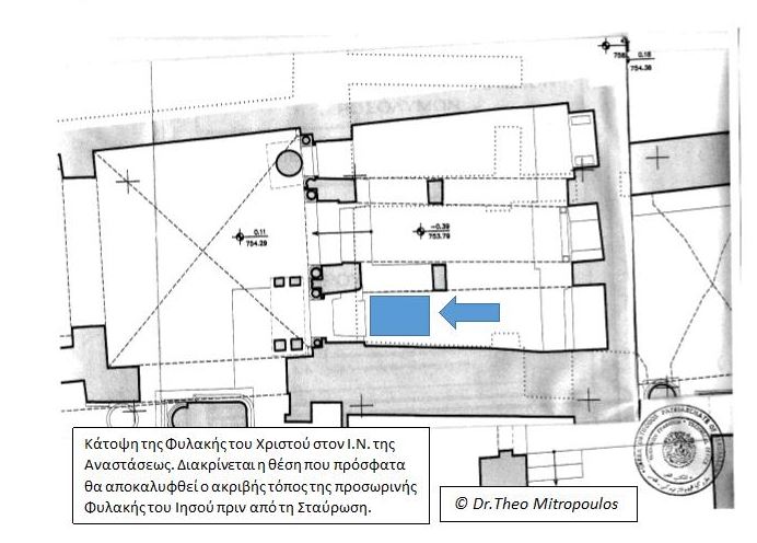 Εκεί που εξακριβώσαµε ότι θα πρέπει να υπήρξε το κελί της προσωρινής φυλάκισης του Ιησού» αναφέρει ο διευθυντής του Τεχνικού Γραφείου του Πατριαρχείου Ιεροσολύµων. Και συνεχίζει: «Ο τόπος που φυλακίστηκε ο Χριστός για ένα σύντοµο χρονικό διάστηµα πριν από τη Σταύρωση βρίσκεται στη νοτιοδυτική γωνία της φυλακής. Ο χώρος αυτός έχει διαστάσεις 1,20Χ1,00 µ. και ήταν λιθοπερίκτιστος ορθογωνικός, χωρίς ανοίγµατα.
