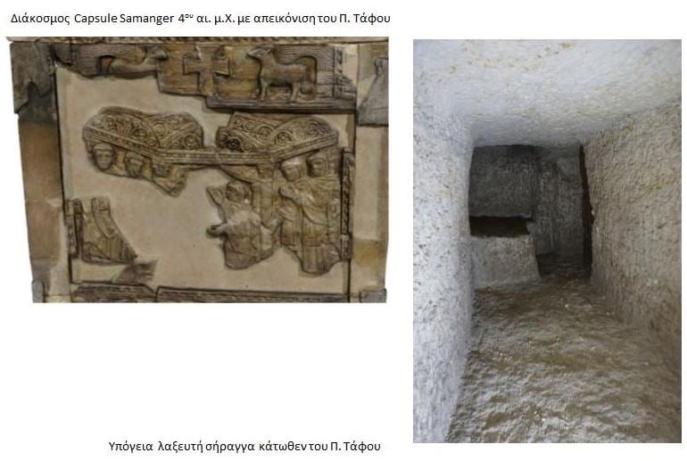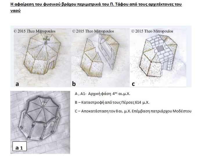 Ο βράχος στον οποίο είναι λαξευµένος ο Πανάγιος Τάφος είναι αυτοφυής, αυθεντικός και συµπαγής, όπως φαίνεται και στη φωτογραφία της υπόγειας λαξευτής σήραγγας (ρωµαϊκής περιόδου favila sotteranea που συνδεόταν µε το Καπιτώλιο) που διέρχεται κάτω από τον Πανάγιο Τάφο» καταλήγει ο κ. Μητρόπουλος.