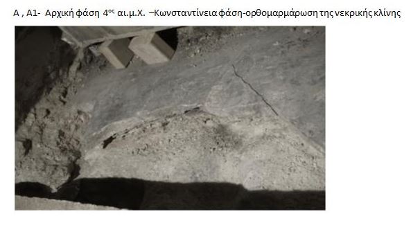 Η µαρµάρινη πλάκα της κωνσταντίνειας αυτής φάσης, όπως φαίνεται στη φωτογραφία που είναι µερικώς βανδαλισµένη από το 614 µ.Χ. από τους Πέρσες, προστάτευσε το νεκρικό κρεβάτι. Οι αναλύσεις του συνδετικού κονιάµατος της ορθοµαρµάρωσης αυτής ταυτοποίησαν ορθά ότι ανήκει στον 4ο αιώνα και όχι ότι ο Τάφος του Ιησού Χριστού είναι κατασκεύασµα του 4ου αιώνα.