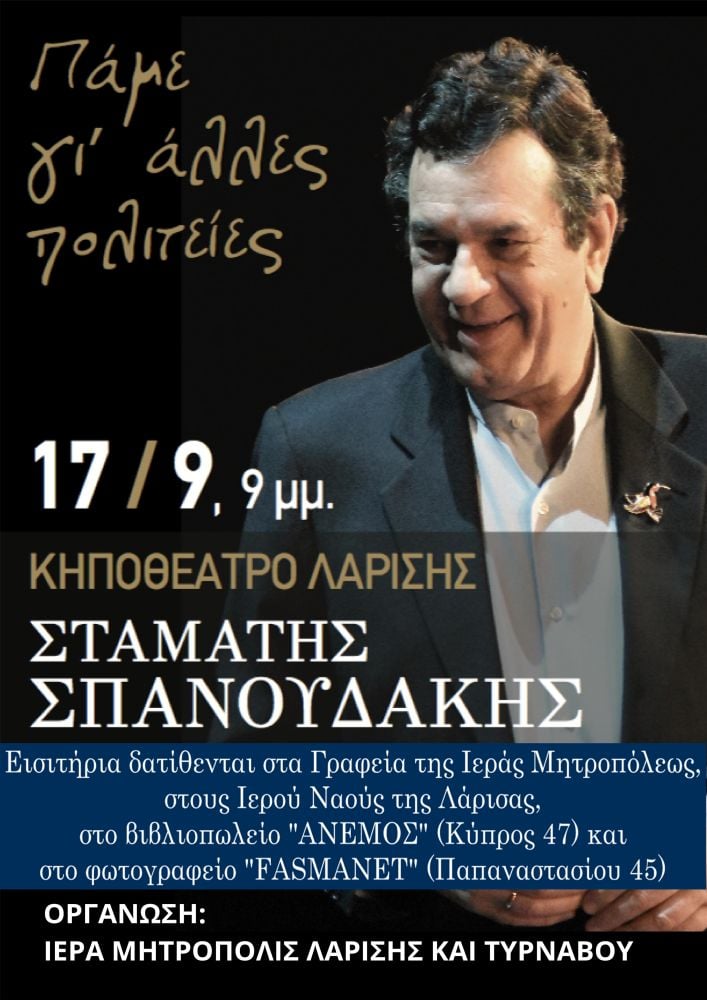 Στο Κηποθέατρο Λαρίσης, την Τρίτη 17 Σεπτεμβρίου 2019 και ώρα 21.00, η Ιερά Μητρόπολη Λαρίσης και Τυρνάβου, με την ευκαιρία της ενάρξεως της νέας ακαδημαϊκής και πνευματικής χρονιάς, και στο πλαίσιο της φιλανθρωπικής και ποιμαντικής μέριμνάς της, διοργανώνει μία συναυλία με έργα του σπουδαίου καλλιτέχνη Σταμάτη Σπανουδάκη, ο οποίος θα παρουσιάσει το πρόγραμμά του με τίτλο: «Πάμε γι’ άλλες πολιτείες!».