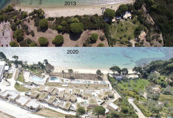 Το ΤΑΙΠΕΔ παραχώρησε το πρώην Ξενία για χρήση 99 χρόνων σε επιχειρηματία, ο οποίος ταυτόχρονα αγόρασε από γνωστή εφοπλιστική οικογένεια μια παρακείμενη έκταση 100 στρ., προκειμένου να χτίσει 78 διώροφες κατοικίες με πισίνα, όπου τον τελευταίο χρόνο, σύμφωνα με τις καταγγελίες, έχουν αποψιλωθεί πάνω από 40 δέντρα. ως τουριστικό χωριό. Όπως καταγγέλλει ο κ. Τζούμας, οι υπεύθυνοι του ξενοδοχείου δεν συνεργάζονται με τις υπηρεσίες του δήμου και προβαίνουν σε αυθαίρετες ενέργειες, οι οποίες προκαλούν ανεπανόρθωτη ζημιά στο φυσικό περιβάλλον. Το ξενοδοχειακό συγκρότημα βρίσκεται σε μια περιοχή ιδιαίτερου φυσικού κάλλους, που είναι και προστατευόμενη περιοχή NATURA 2000, μέσα στο πασίγνωστο δάσος των Κουκουναριών. Η δημοτική αρχή έχει καταθέσει δύο μηνύσεις σε βάρος των ιδιοκτητών του ξενοδοχειακού συγκροτήματος και δεν αποκλείει να προχωρήσει ακόμη και σε ανάκληση της άδειας λειτουργίας, αν δεν υπάρξει συμμόρφωση από την πλευρά τους και αν δεν περιοριστούν σε όση έκταση τους ανήκει, αφήνοντας ελεύθερους τους κοινόχρηστους χώρους.